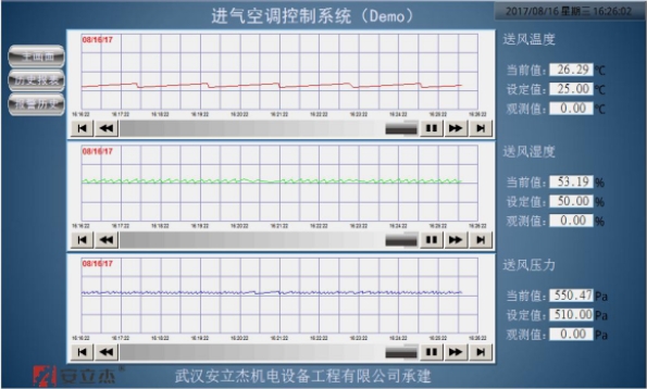 基于空氣調節技術,我公司提出了進氣空調的總體控制方法,即變風量、恒壓、恒溫恒濕空氣調節方法。基于西門子S7-300系列PLC及其擴展模塊和外圍電氣設備,設計了擁有自主知識產權的進氣空調溫濕度控制系統和進氣壓力控制系統的硬件電路及控制系統軟件。